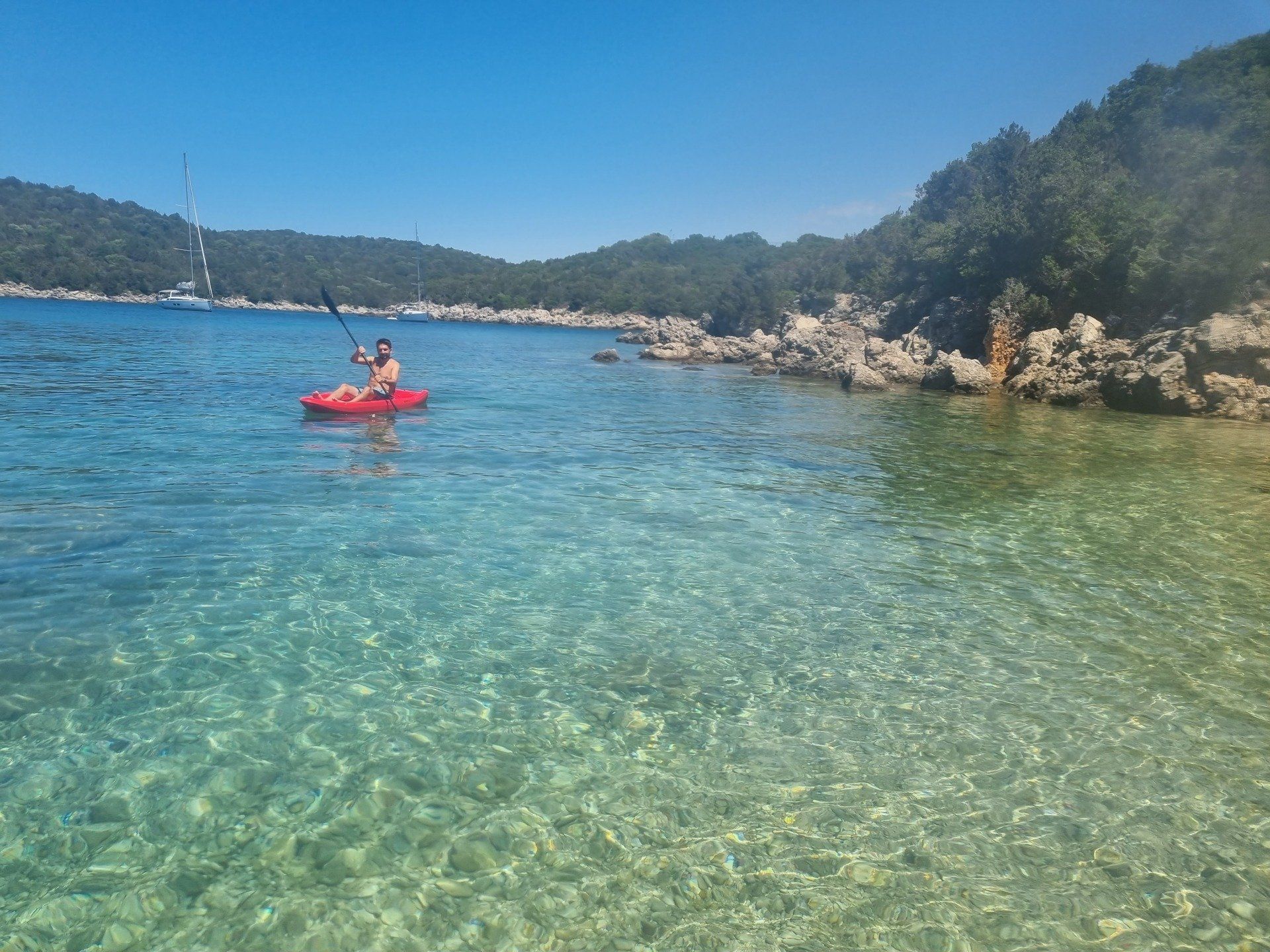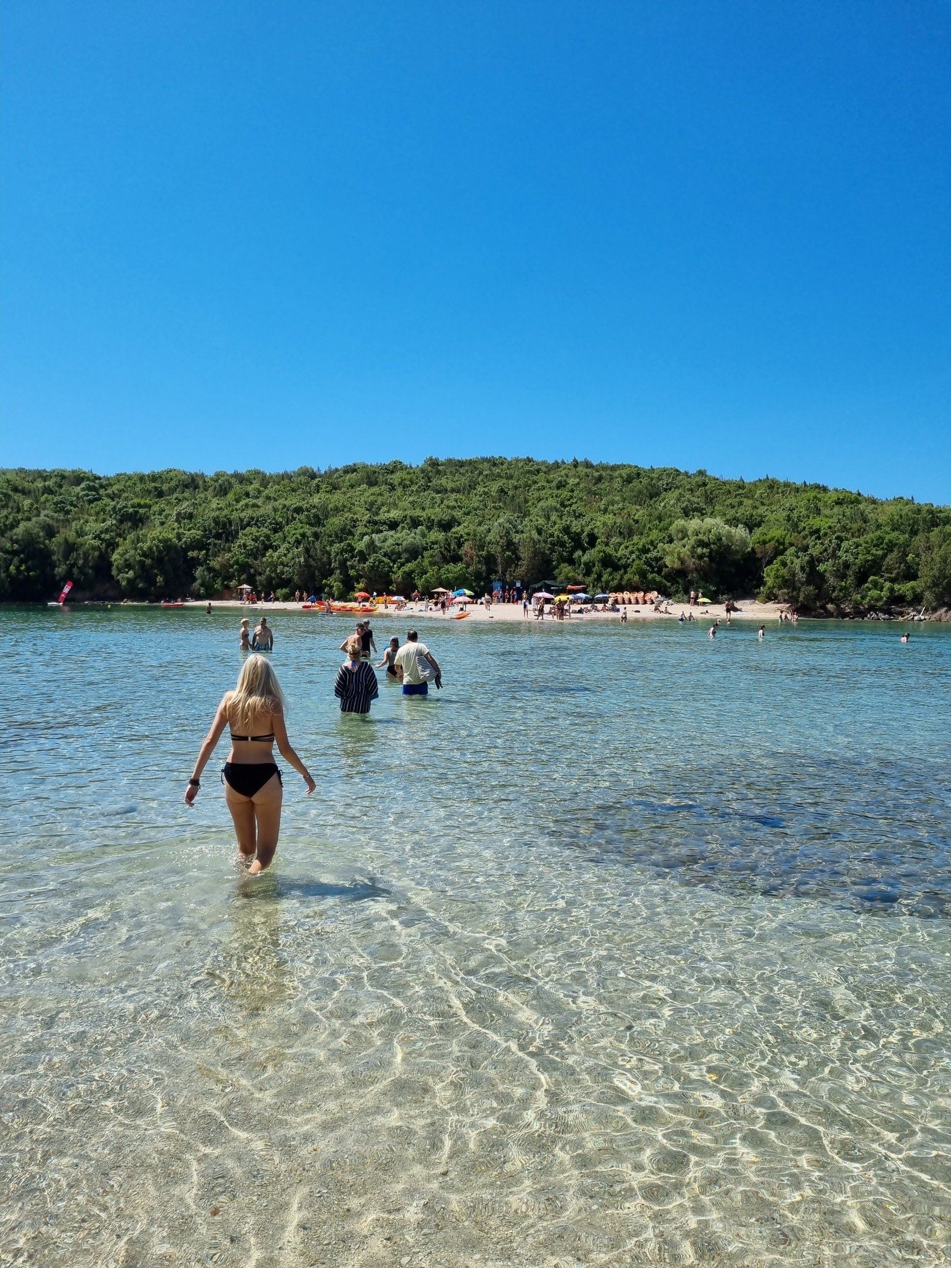 Heute sollte das Auto auf dem Hotelparkplatz bleiben und wir wollten den malerischen Küstenort Syvota zu Fuß erkunden. Durch das hüfthohe türkisblaue Wasser machten wir uns auf zu der nahegelegenen kleinen Insel Mourtemeno, die man so zu Fuß erreichen konnte. Hier liehen wir uns jeweils ein Kanu, schipperten entlang der grünen Insel durch die traumhafte Landschaft und legten an einem Strand für ein kurzes Bad an. Gegen Abend flanierten wir durch das Fischerdorf und gingen traditionell griechisch essen - mit Gyros und viel Wein.