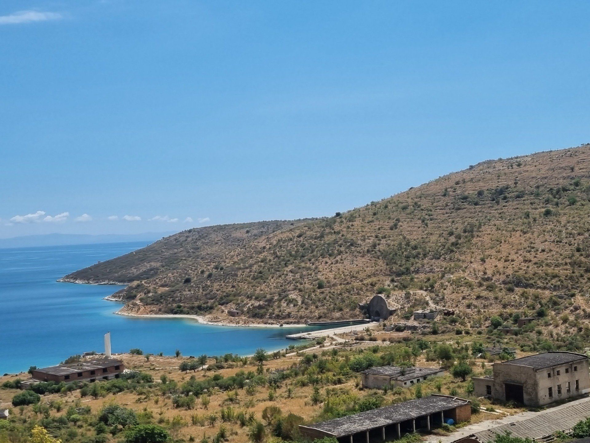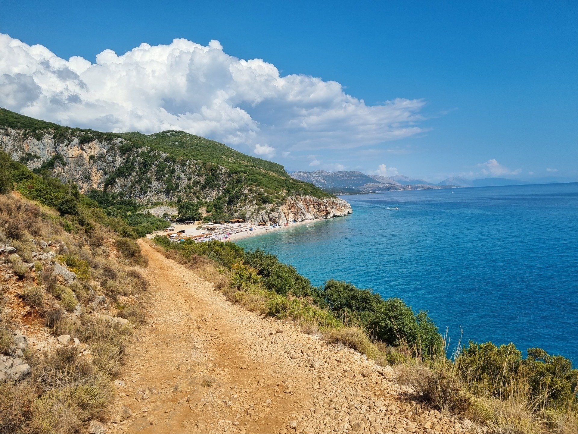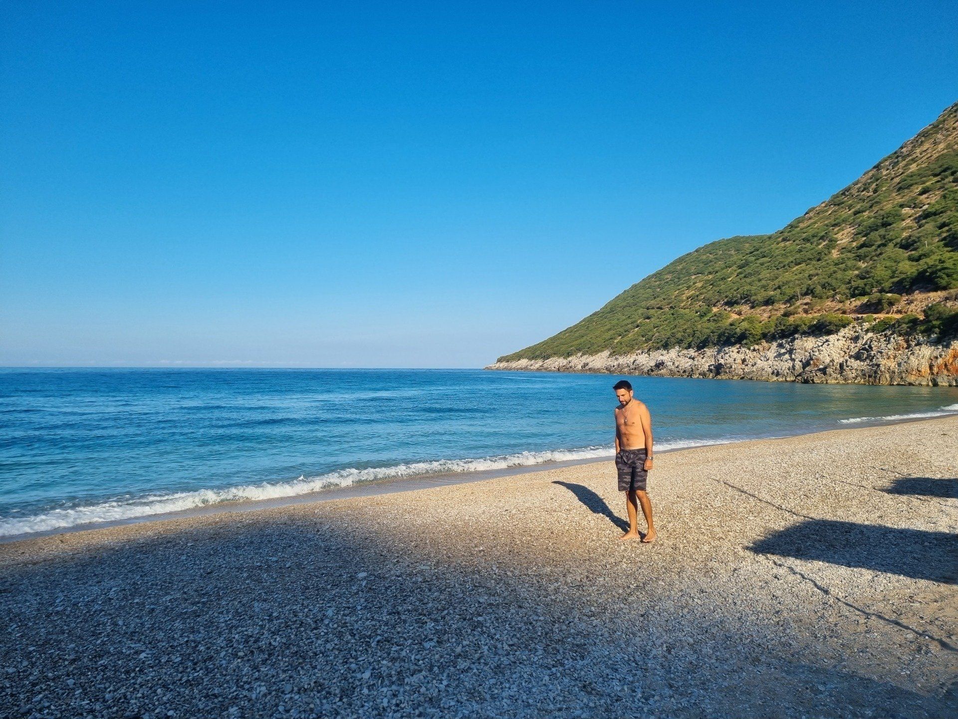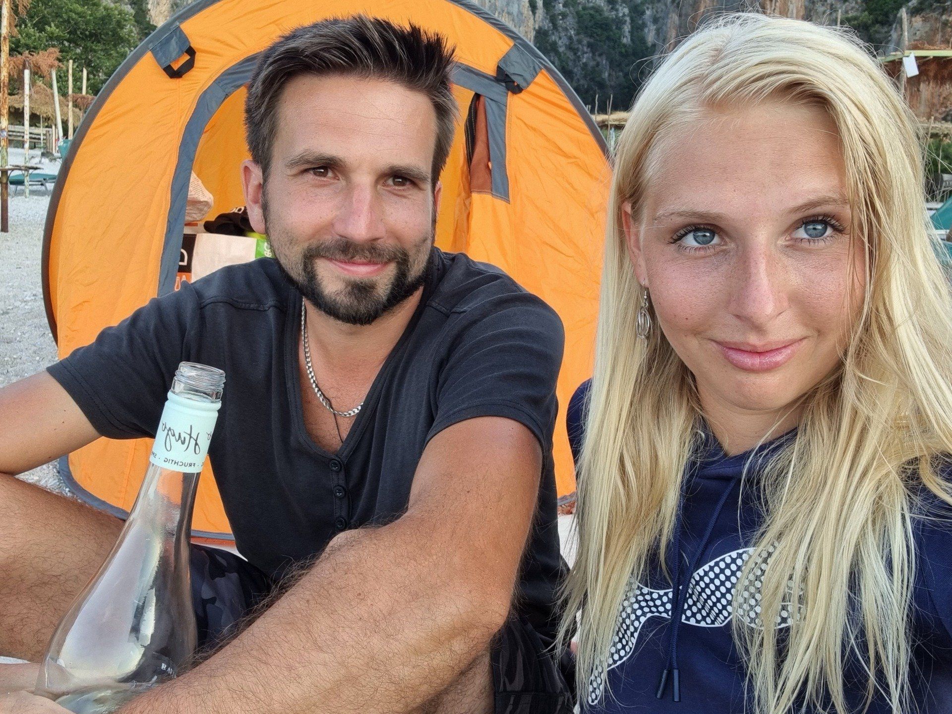 Nach einer Nacht im Delight Hotel fuhren wir mit dem Cabrio ganz gemütlich entlang der Küste Albaniens zum Gjipe-Beach. Heute wollten wir ein kleines Abenteuer wagen: Wildcamping am Strand! Nach unseren Recherchen sollte sich Gjipe-Beach hierfür bestens eignen. Der Strand ist zwar nicht mit dem Auto erreichbar, soll dafür aber nicht so überlaufen sein. Parken kann man fußläufig circa eine halbe Stunde entfernt vom Strand. Der Weg über den Canyon hinab ist aber nicht ganz unbeschwerlich - vor allem mit Rucksack und Wurfzelt sowie in Badelatschen. Besseres Schuhwerk ist empfehlenswert! Auf dem Weg kommt man bei einem kleinen Bunker vorbei, wo wir eine kurze Pause einlegten und die Aussicht genossen. Schon bald hatte man einen atemberaubenden Blick auf die Bucht, den Canyon, das Meer und die Berge. Ein einsamer Strand war es zwar nicht, aber überlaufen war er immerhin auch nicht. Wir erkundeten die Umgebung, wanderten ein wenig in den Canyon hinein und badeten im kristallklaren Wasser. Gegen Abend, als fast alle Besucher den Strand verließen, schlugen wir unser Zelt auf und genossen den lauen Sommerabend mit leckeren Getränken und Snacks, guten Gesprächen und ganz viel Zweisamkeit. Am Strand verteilt befanden sich noch ein paar weitere Zelte, die es uns gleich zu tun schienen. Wir entschieden, im Mondlicht ungestört im Meer baden zu gehen - was für ein Gefühl von Freiheit! Danach packten wir uns in warme, gemütliche Kleidung und legten uns zum Schlafen in das Wurfzelt - die Türe ließen wir noch offen, damit wir das Meer nicht nur hören, sondern den Wellen auch noch zusehen konnten. Plötzlich kam eine Monsterwelle, die fast bis zu unserem Zelt reichte, es aber doch nicht ganz erfasste. Andere, die ihr Lager noch näher am Meer aufgeschlagen hatten, wurden wohl überflutet und entschieden sich demnach für eine Nacht unter freiem Himmel. Wir machten den Reißverschluss unseres Zelteingangs zu und schliefen beim Rauschen der Wellen ein.